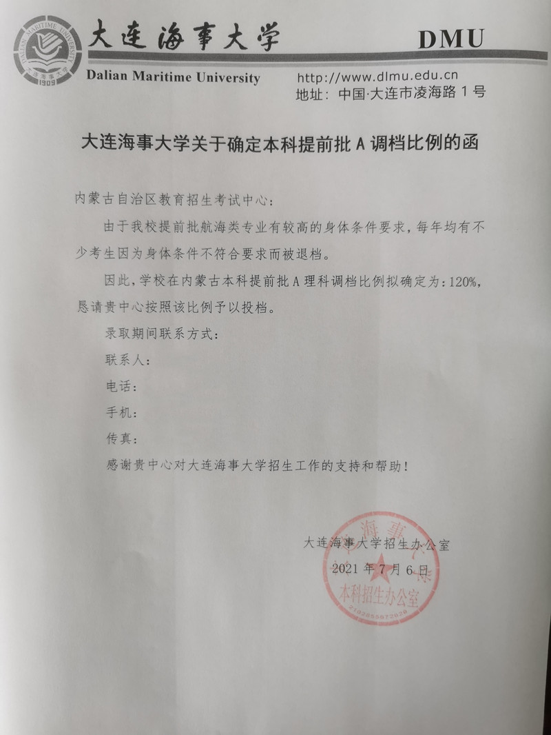 本科提前批A-大连海事大学(代号:250)关于调档比例确定为120%的说明
