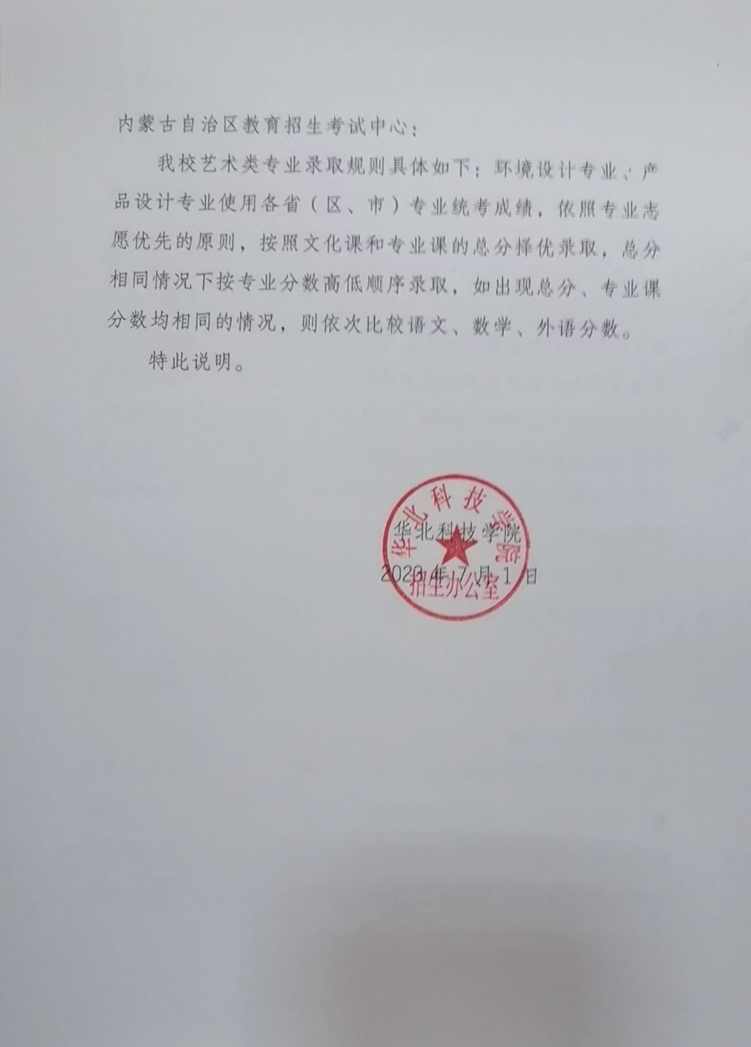 华北科技学院--本科提前批A--艺术类录取规则补充说明