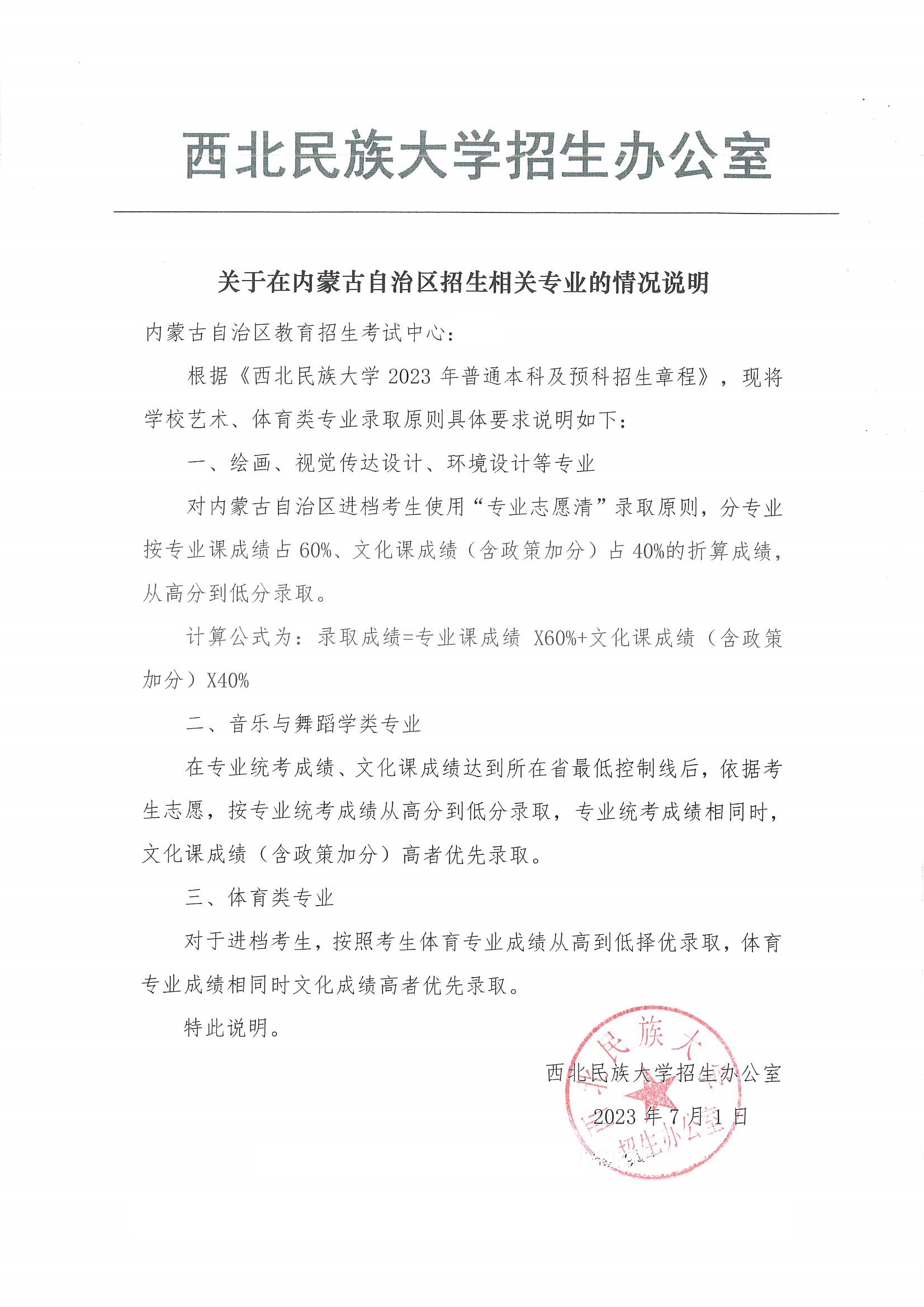 西北民族大学--本科提前批A--艺术类录取规则补充说明