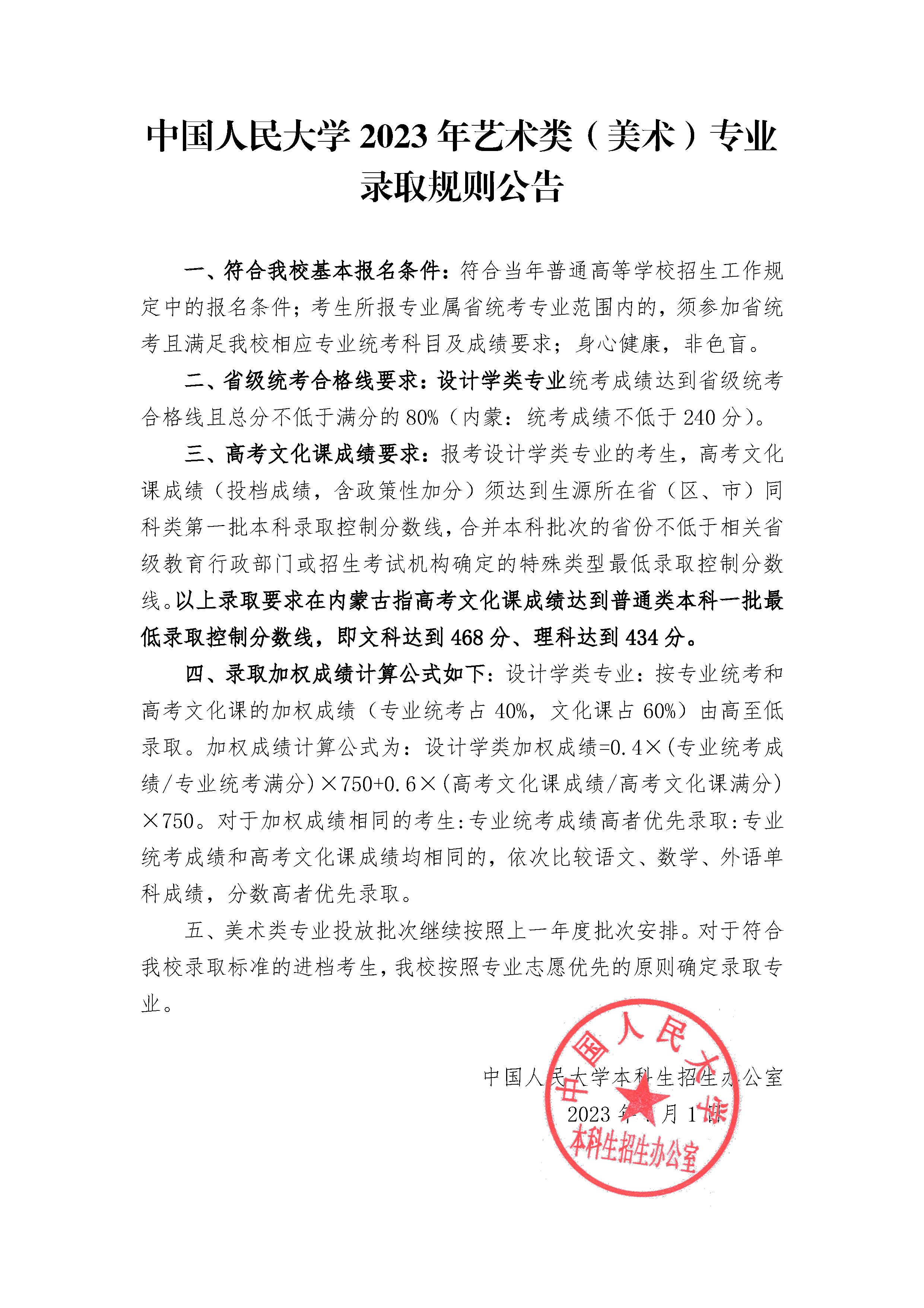 中国人民大学--本科提前批A--艺术类录取规则补充说明