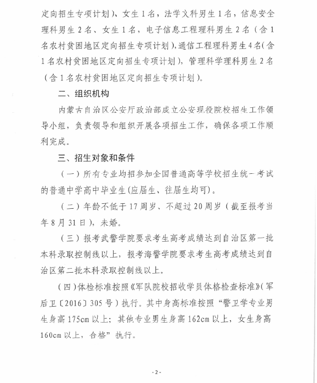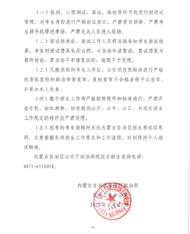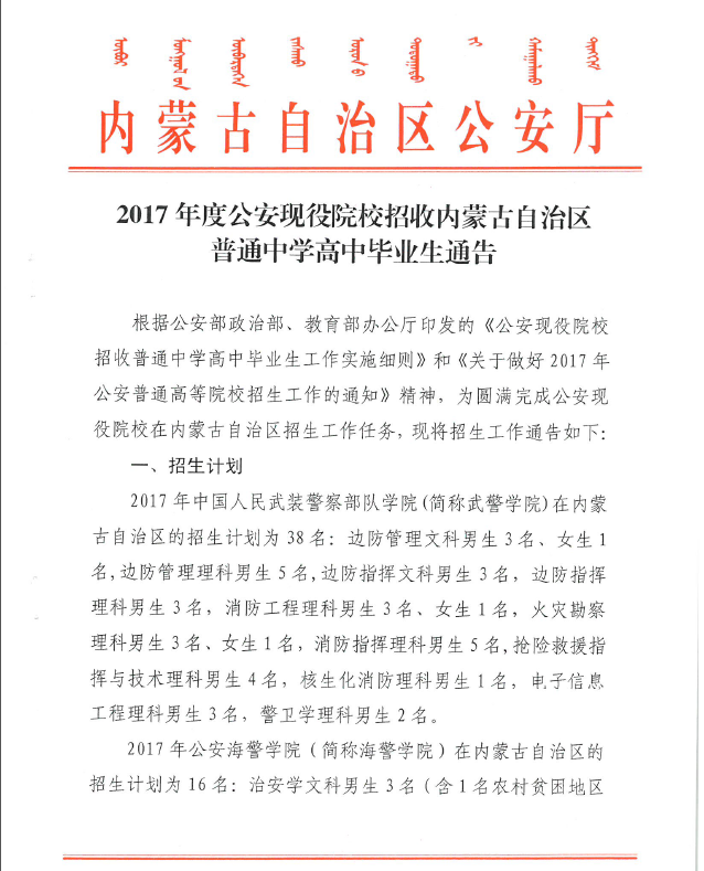 当前位置: 首页 >> 考试招生 >> 普通高考 >> 高考公告 2017年度公安现役院校招收内蒙古自治区普通中学高中毕业生通告(附政审表) 发布时间: 2017-06-26 10:52 来源: 考务一处