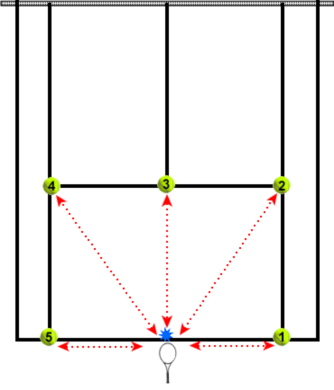 将一支球拍放在底线中点后面,拍头指向球网,5个球的位置如图所示(图1)。从底线中点开始,沿着逆时针方向依次取回5个球,将每次取回的球放在球拍拍面上。考评员喊‘预备-开始’之后,秒表计时开始,完成第五球时结束。