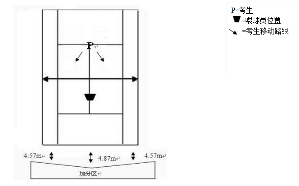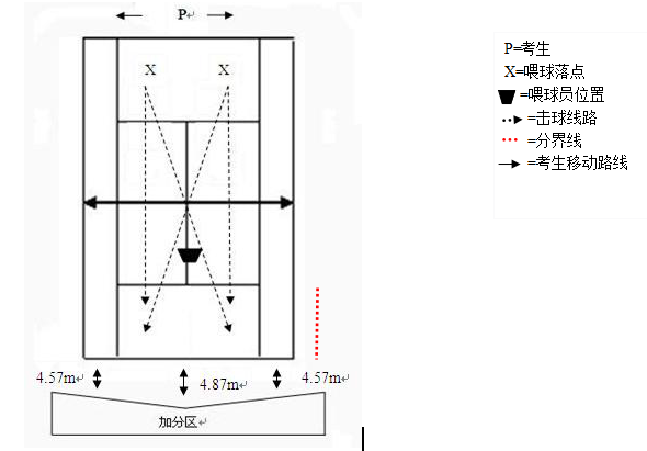 考生从底线中点位置之后开始,正、反手交替各击5次斜线球(共10个球),接着正、反手交替各击5次直线球(共10个球)要求击球的落点尽可能进入指定的区域。考评员站在发球线与网之间半程F处喂球,将球喂至发球线与底线之间半程处X的位置,尽可能使考生