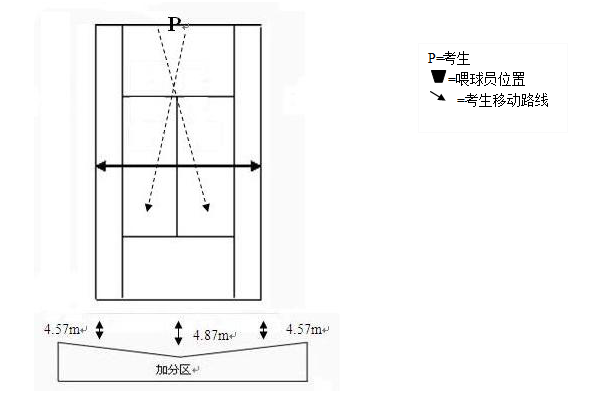 考生站在发球位置,一区发球5次,二区发球5次。如果发球擦网落入有效发球区,则重发。
