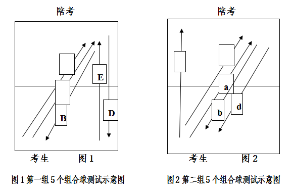 第一组5个组合球测试方法见(图1)。考生发下旋球后(箭头A),陪考将球搓到考生反手位(箭头B),考生用反手搓球技术将球搓至陪考反手位(箭头C),再由陪考将球搓至考生正手位(箭头D),考生用拉(攻)的技术将球击回到陪考的反手位(箭头E)。第二组5个组合球测试方法见(图2)。考生发下旋球后(a),陪考将球搓回到考生反手位(b),考生用搓球技术将球搓至陪考的反手位(c),再由陪考将球搓至考生反手位(d),考生侧身拉(攻),将球击中陪考正手位直线处(e)。每人每组可测两次,取其中一组最好成绩为此项成绩。(如:取第一组击中4个球,第二组击中5次,此项击中次数为9次。)要求:考生使用拉(攻)技术时的力量不低于65%。