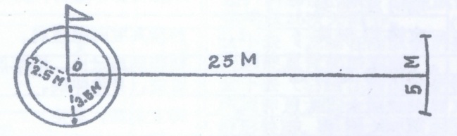 a 以0为圆心,以2.5米和3.5为半径,分别划里、外两个圆。圆心处插上一根1.5米高并系有彩色小旗的标志竿,作为传准的目标。