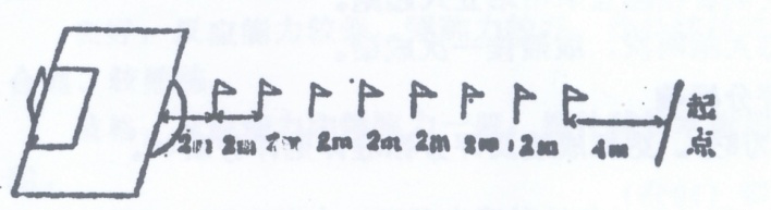 b 距罚球区线2米处起,沿20米垂线插置标竿8根,竿间距离为2米,第8根标竿距起点4米(见图6)。