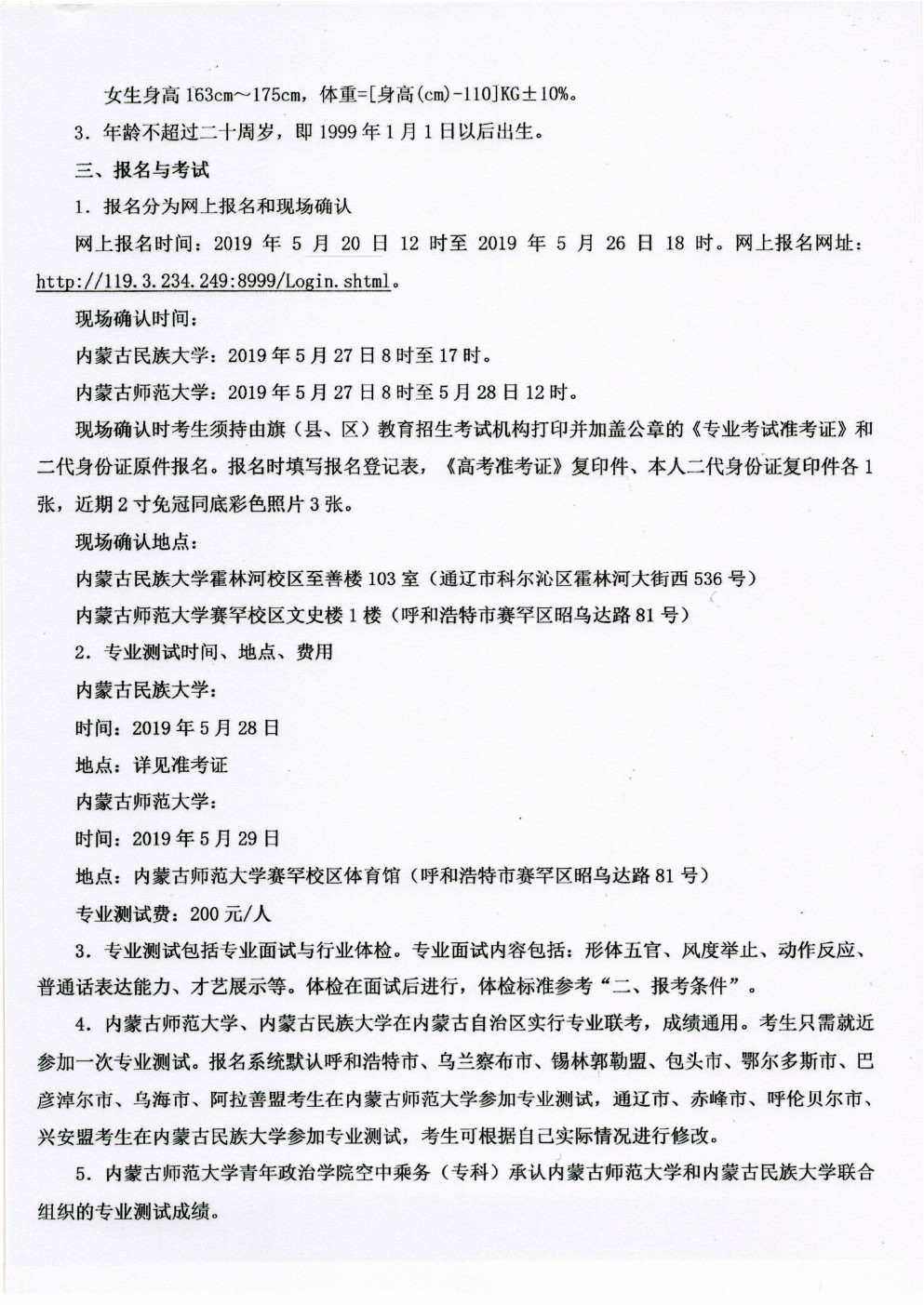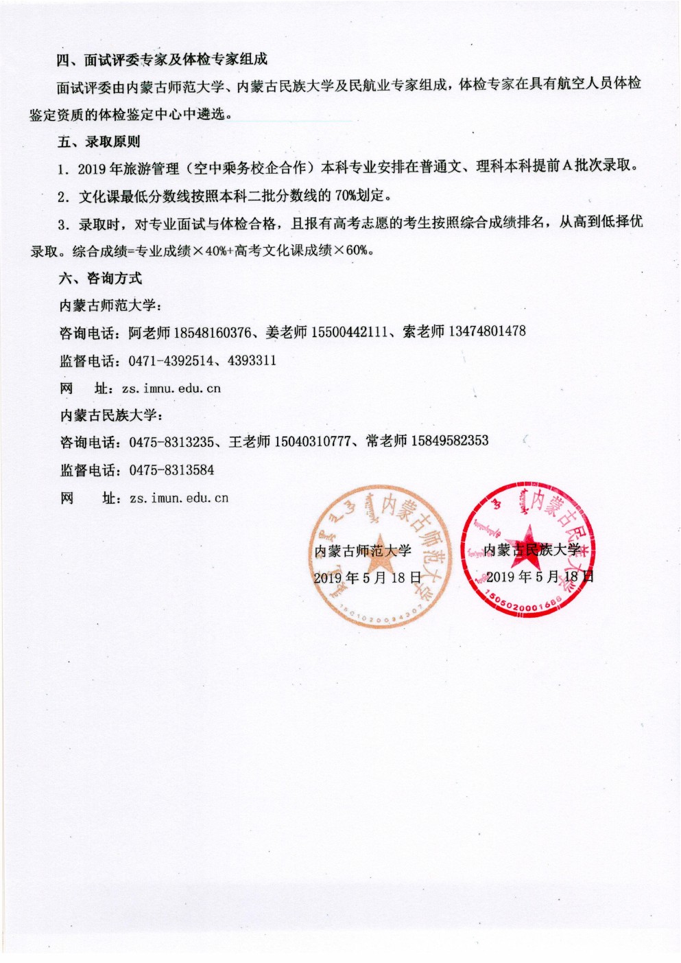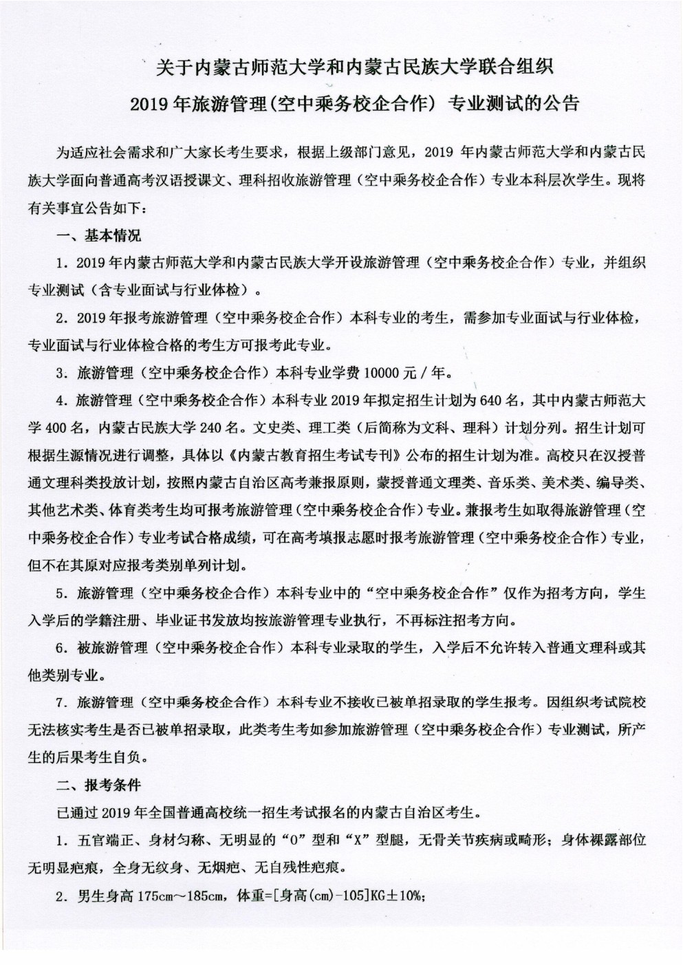 当前位置: 首页 >> 考试招生 >> 普通高考 >> 高考公告 关于内蒙古师范大学和内蒙古民族大学联合组织2019年旅游管理(空中乘务校企合作) 专业测试的公告 发布时间: 2019-05-18 16:37 来源: 考务一处