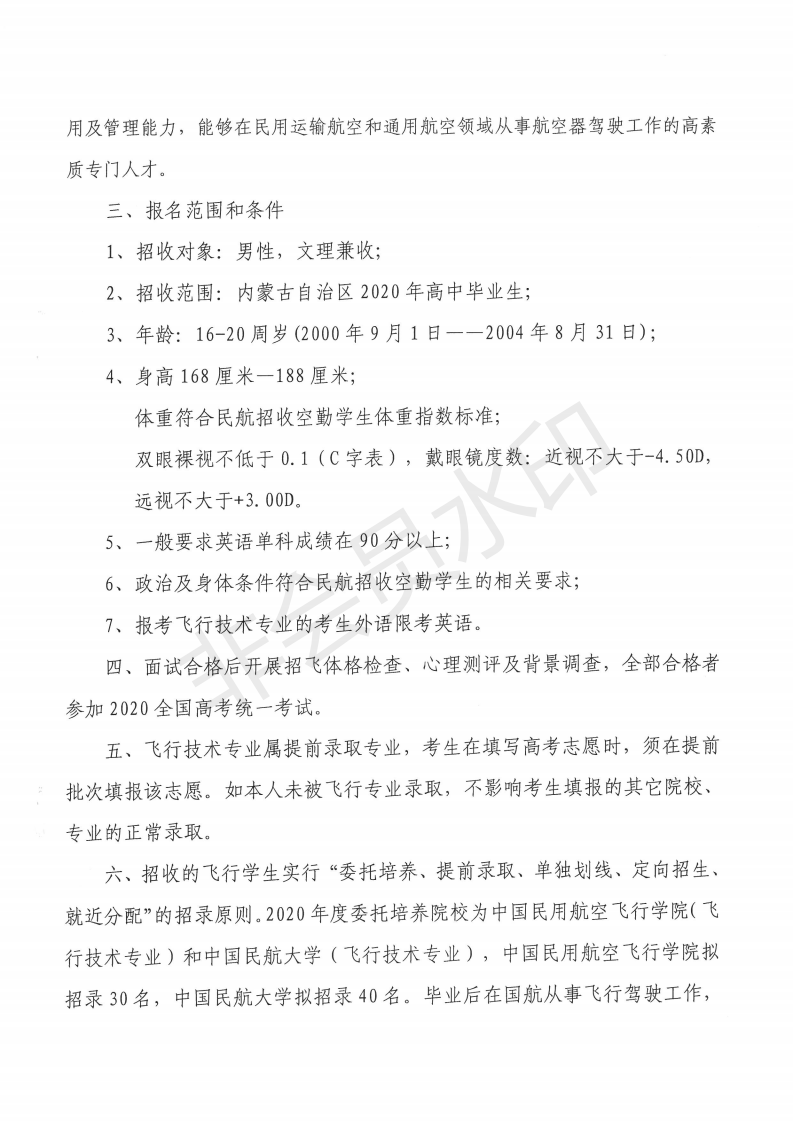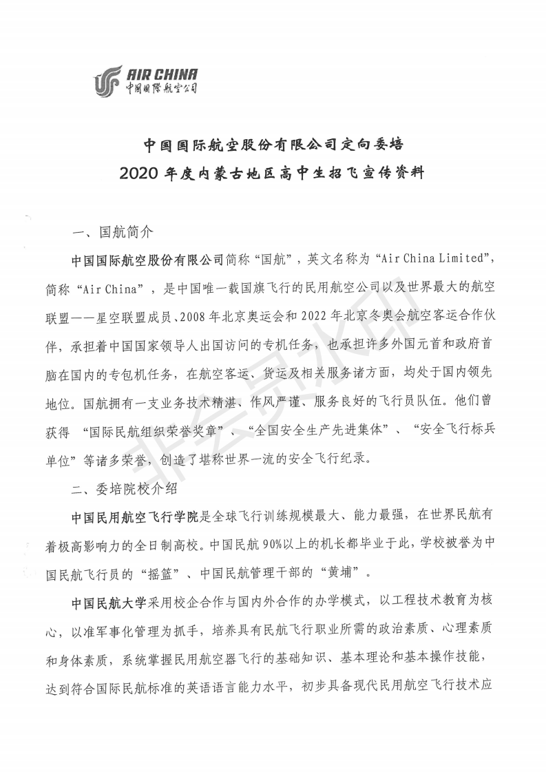 当前位置: 首页 >> 考试招生 >> 普通高考 >> 高考公告 中国国际航空股份有限公司定向委培2020年度内蒙古地区高中生招飞宣传资料 发布时间: 2019-10-26 16:00 来源: 考务一处