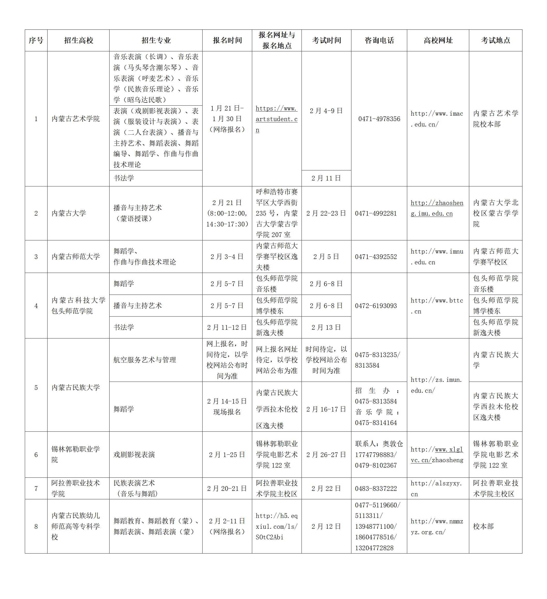 当前位置: 首页 >> 考试招生 >> 普通高考 >> 高考公告 关于公布2020年区内高校艺术类专业校考安排的公告 发布时间: 2020-01-22 11:31 来源: 考务一处 现将2020年区内高校艺术类专业校考安排予以公告,望考生周知。 附件:2020年区内高校艺术类专业校考安排 内蒙古自治区教育招生考试中心 2020年1月20日 附件