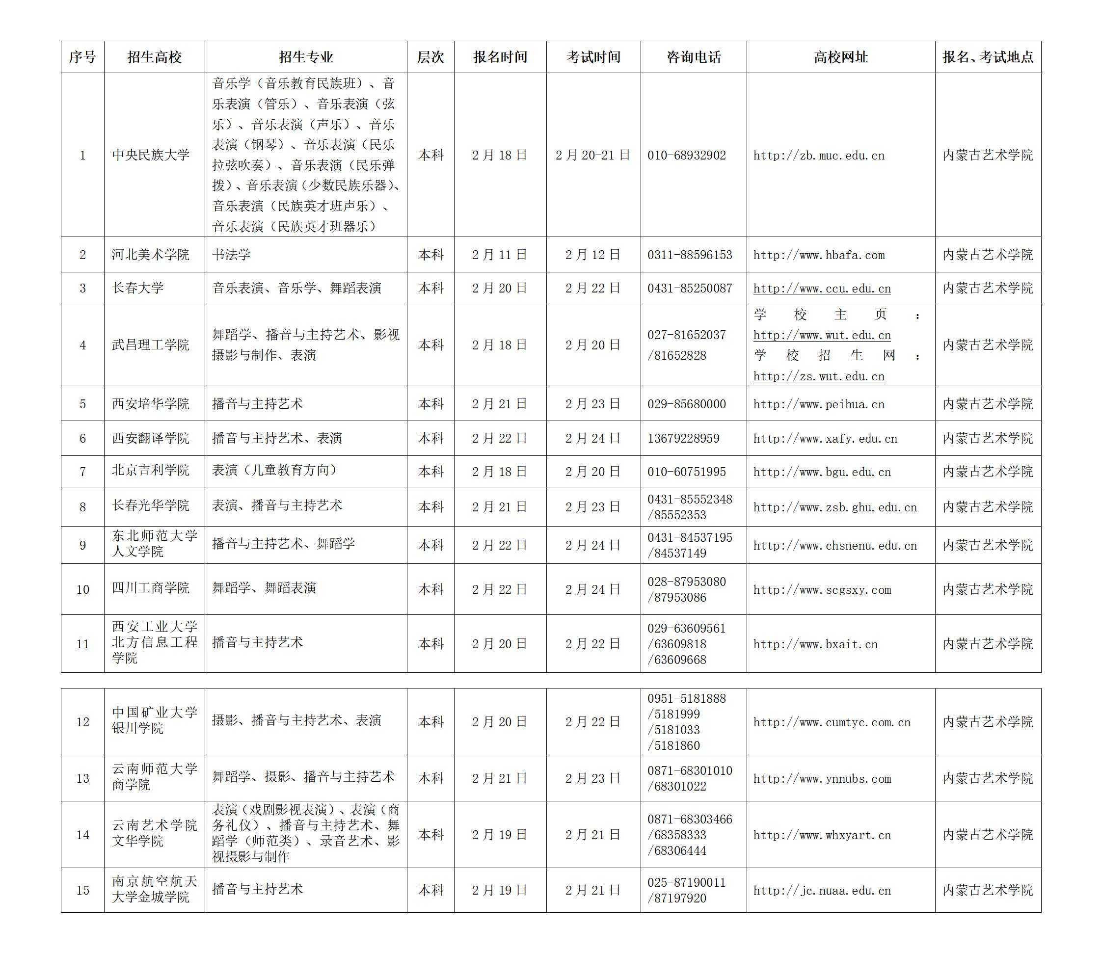 当前位置: 首页 >> 考试招生 >> 普通高考 >> 高考公告 关于公布2020年在我区设点组织校考的招生高校和专业的公告 发布时间: 2020-01-22 11:55 来源: 考务一处 本网讯 现将2020年在我区设点组织校考的招生高校和招生专业予以公告,望考生周知。 附件:2020年在我区设点组织校考的招生高校和招生专业 内蒙古自治区教育招生考试中心 2020年1月20日 附件: 2020年在我区设点组织校考的招生高校和招生专业