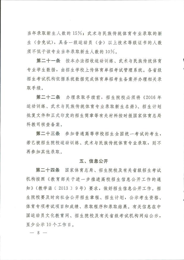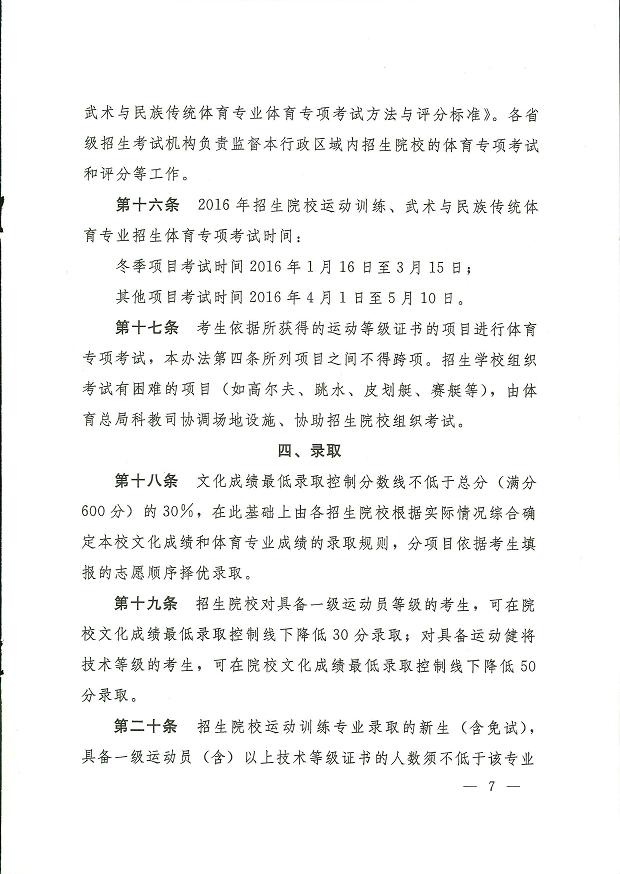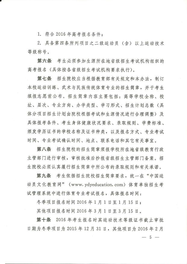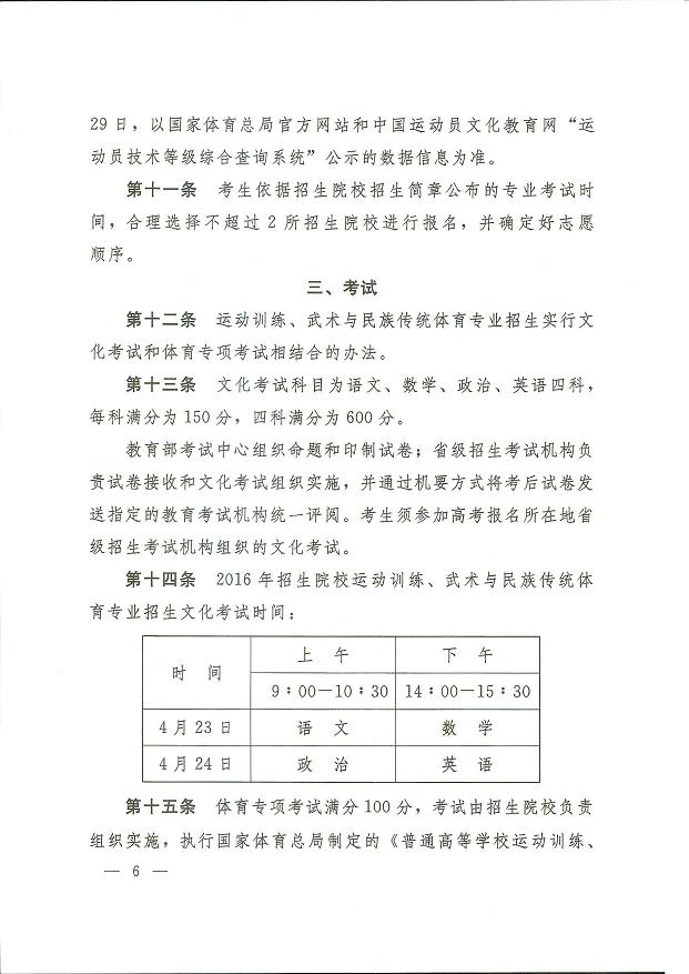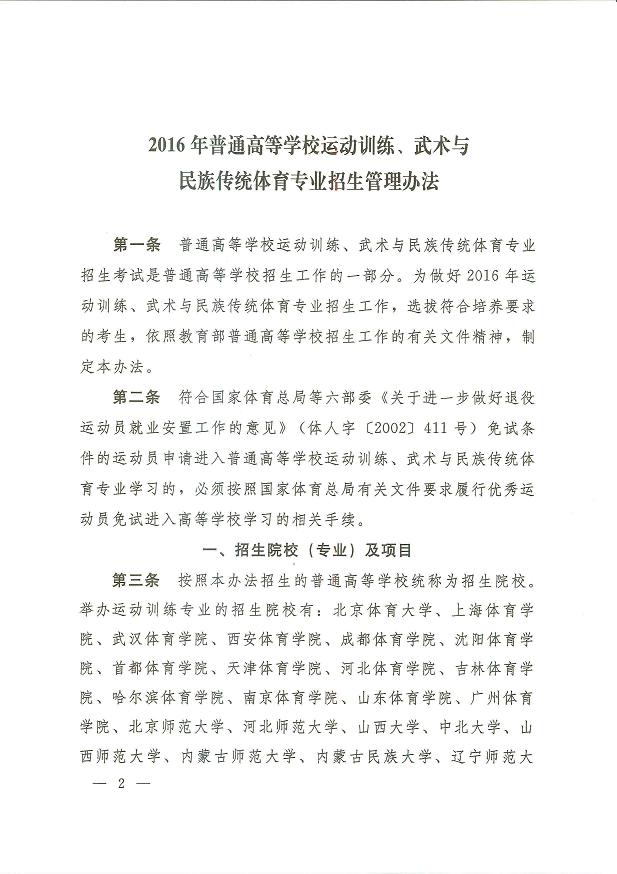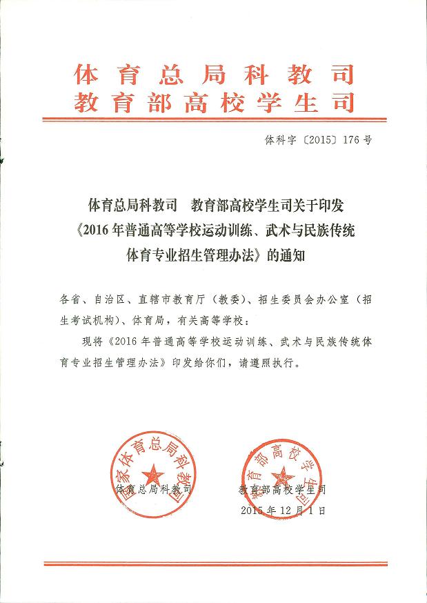 当前位置: 首页 >> 考试招生 >> 普通高考 >> 招生政策 印发《2016年普通高等学校运动训练、武术与民族传统体育专业招生管理办法》的通知 发布时间: 2016-03-02 17:45 来源: 考务一处