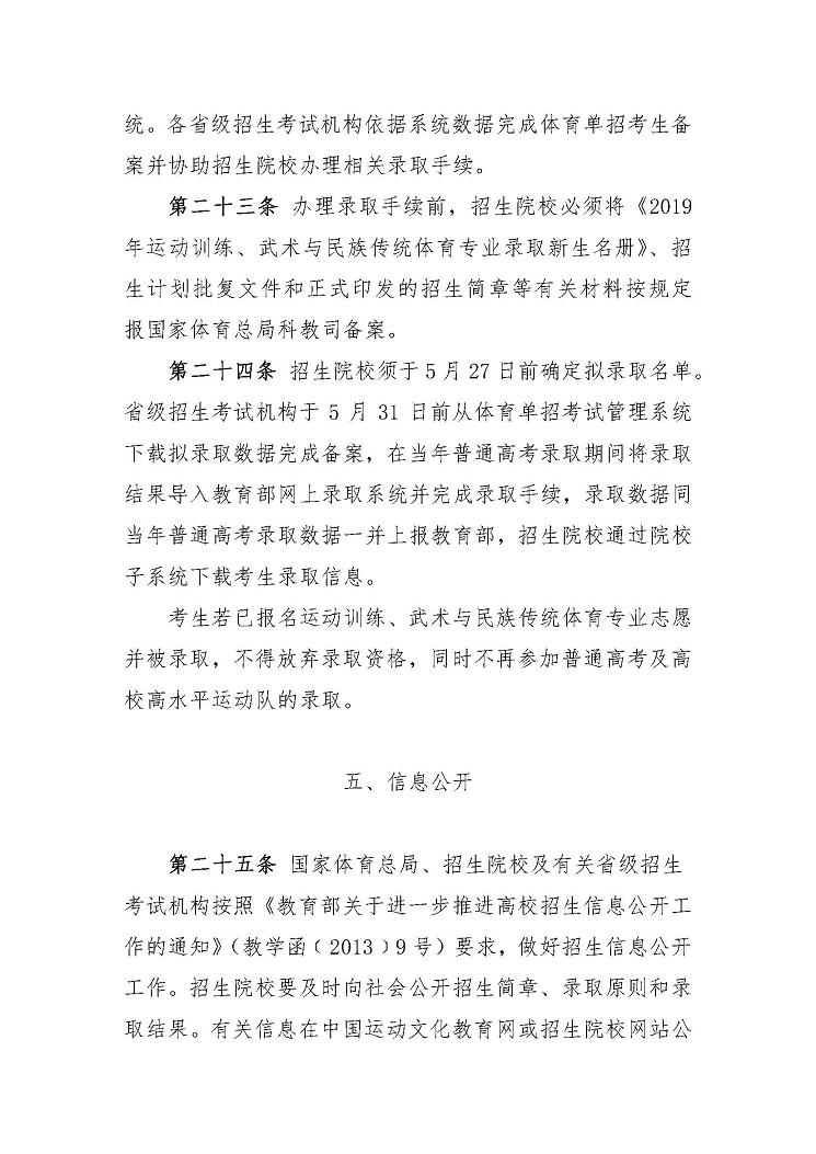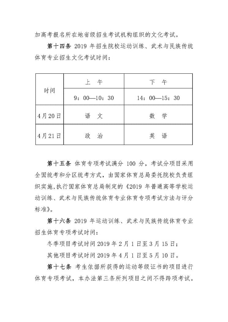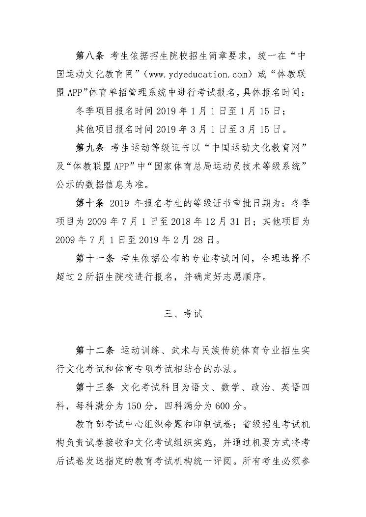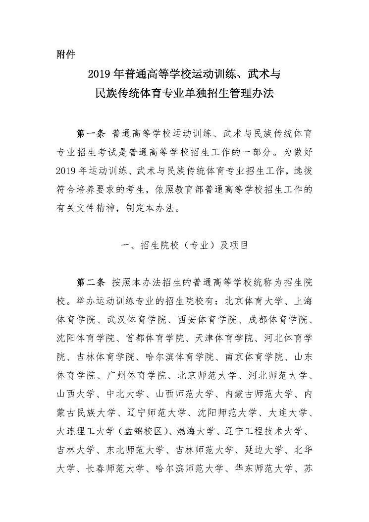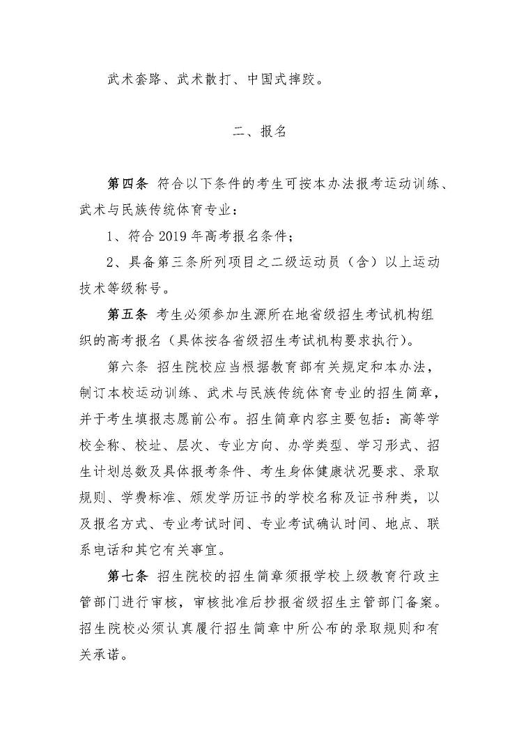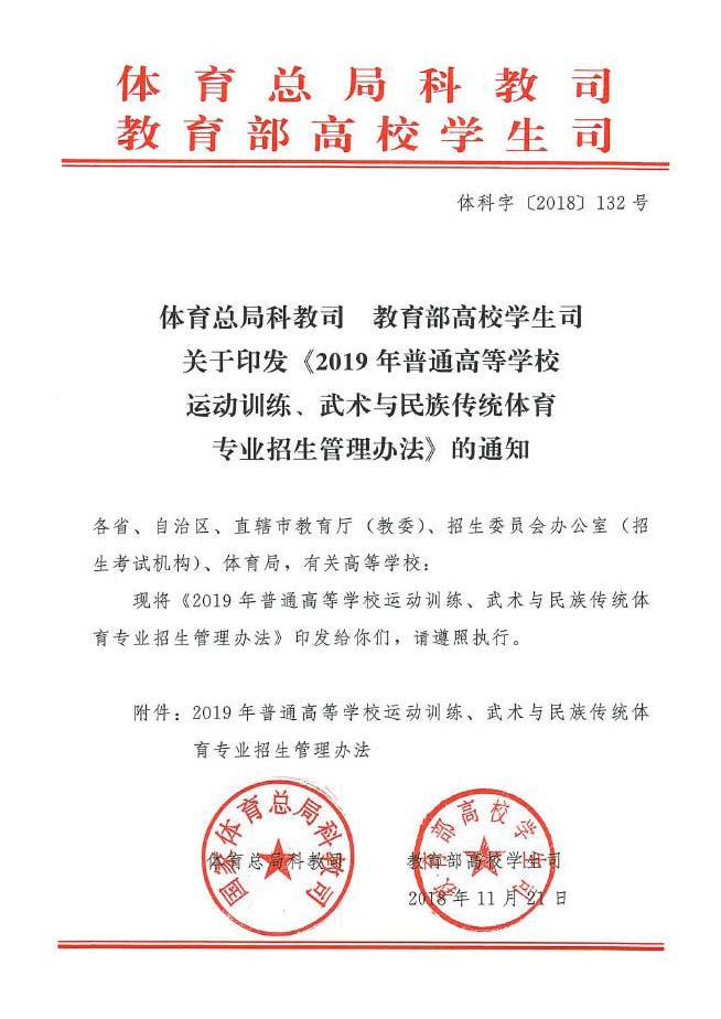 当前位置: 首页 >> 考试招生 >> 普通高考 >> 招生政策 关于印发《2019年普通高等学校运动训练、武术与民族传统体育专业招生管理办法》的通知 发布时间: 2018-11-30 16:01 来源: 考务一处
