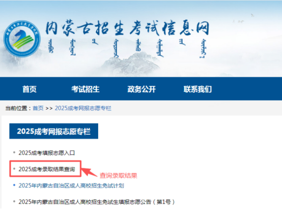 8.关注录取进度,并查询录取结果。考生可登录“内蒙古招生考试信息网”,在“2025成考网报志愿专栏”中,点击“2025成考录取结果查询”;