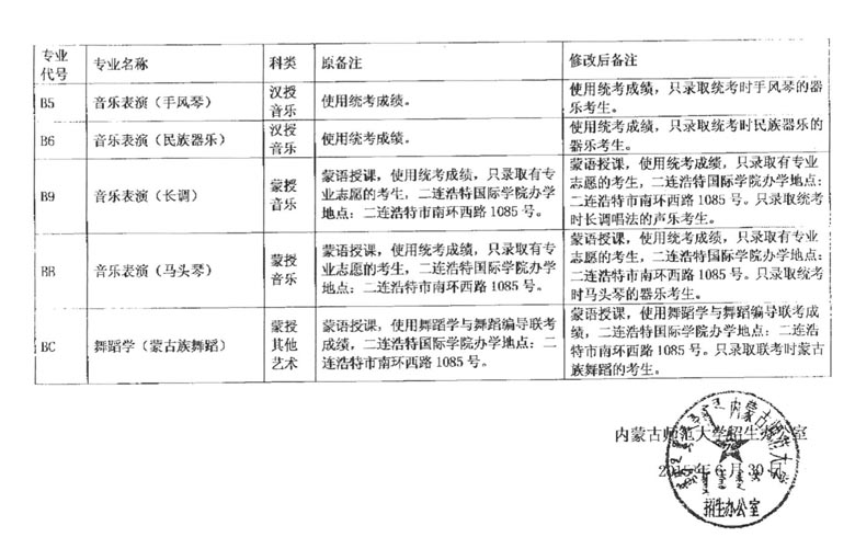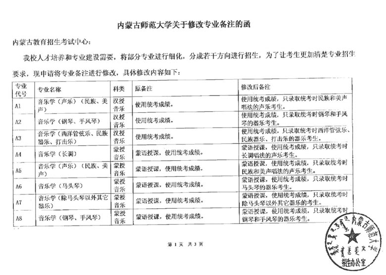 内蒙古师范大学关于修改专业备注的函