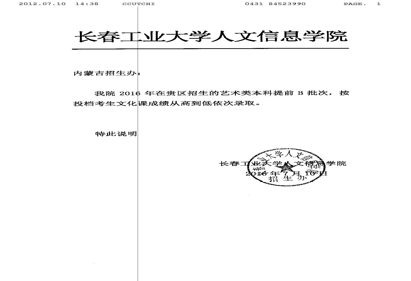 长春工业大学人文信息学院本科提前B艺术类录取规则的补充说明