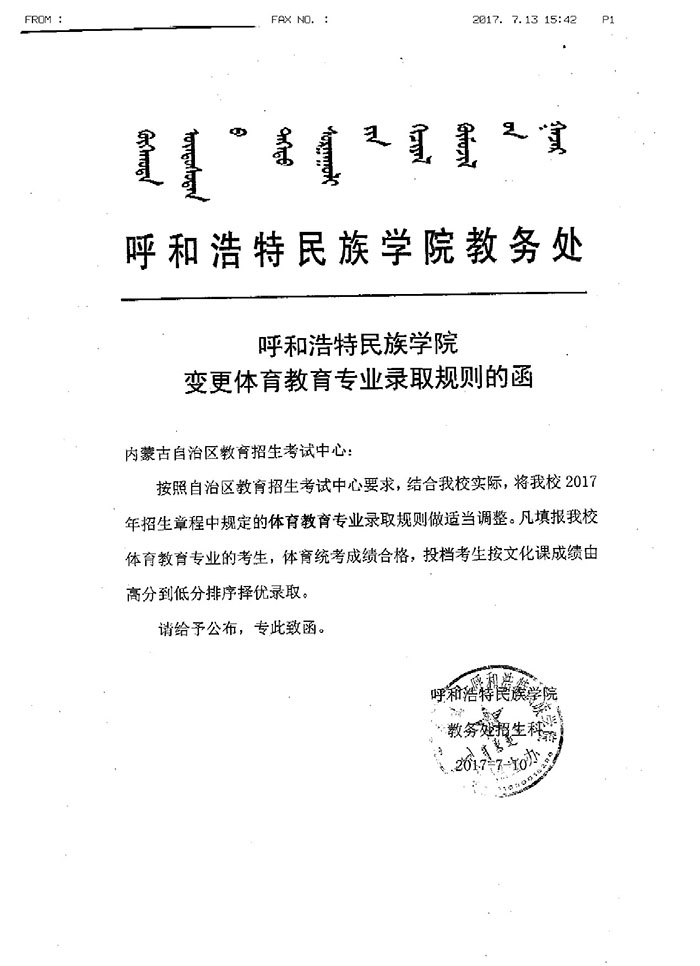 呼和浩特民族学院变更体育教育录取规则的函