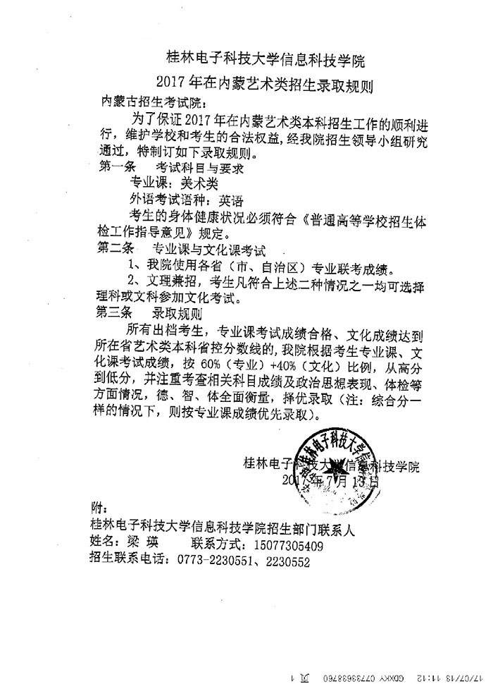桂林电子科技大学信息科技学院艺术类招生录取规则