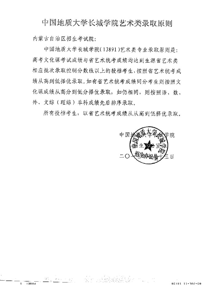 中国地质大学长城学院艺术类录取规则