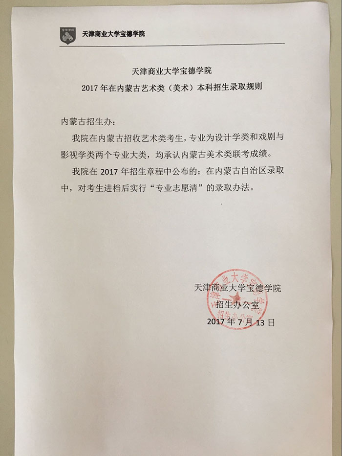 天津商业大学宝德学院艺术录取规则