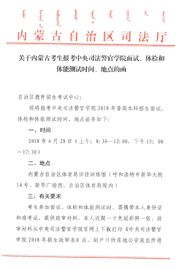 关于内蒙古考生报考中央司法警官学院面试、体检和体能测试时间、地点的通知
