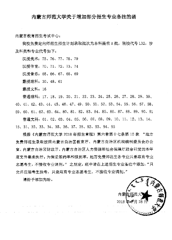 内蒙古师范大学关于增加部分招生专业备注的说明