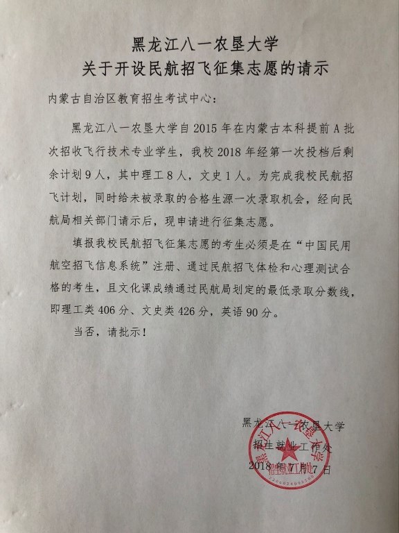 黑龙江八一农垦大学飞行技术专业扩大生源范围征集志愿