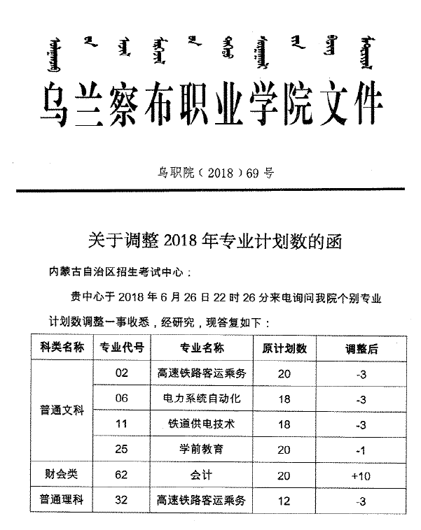 乌兰察布职业学院计划调整的说明