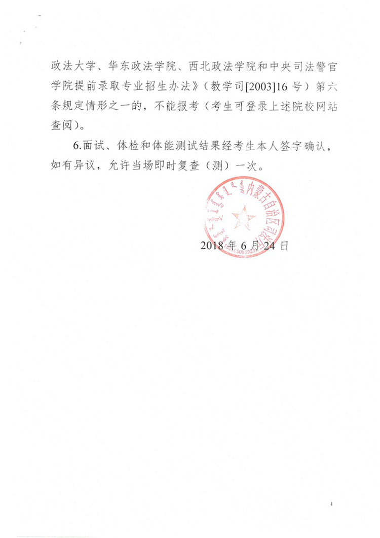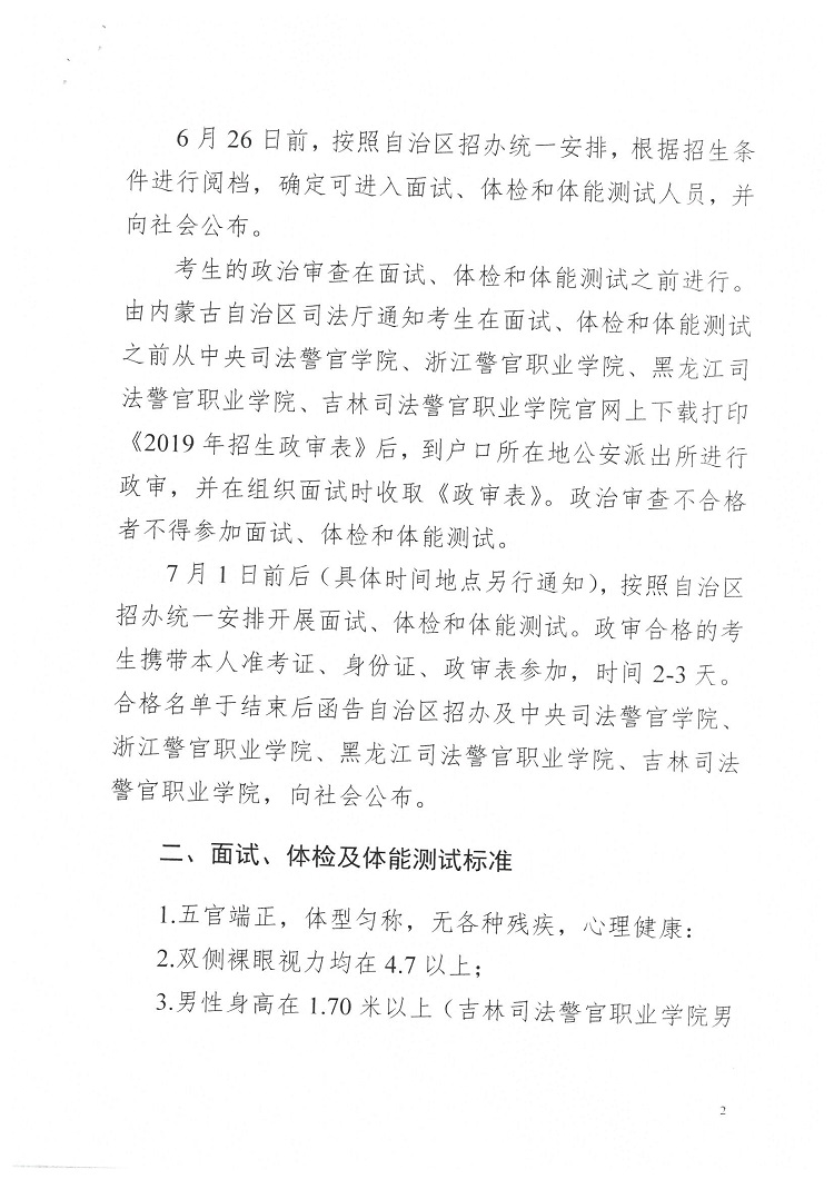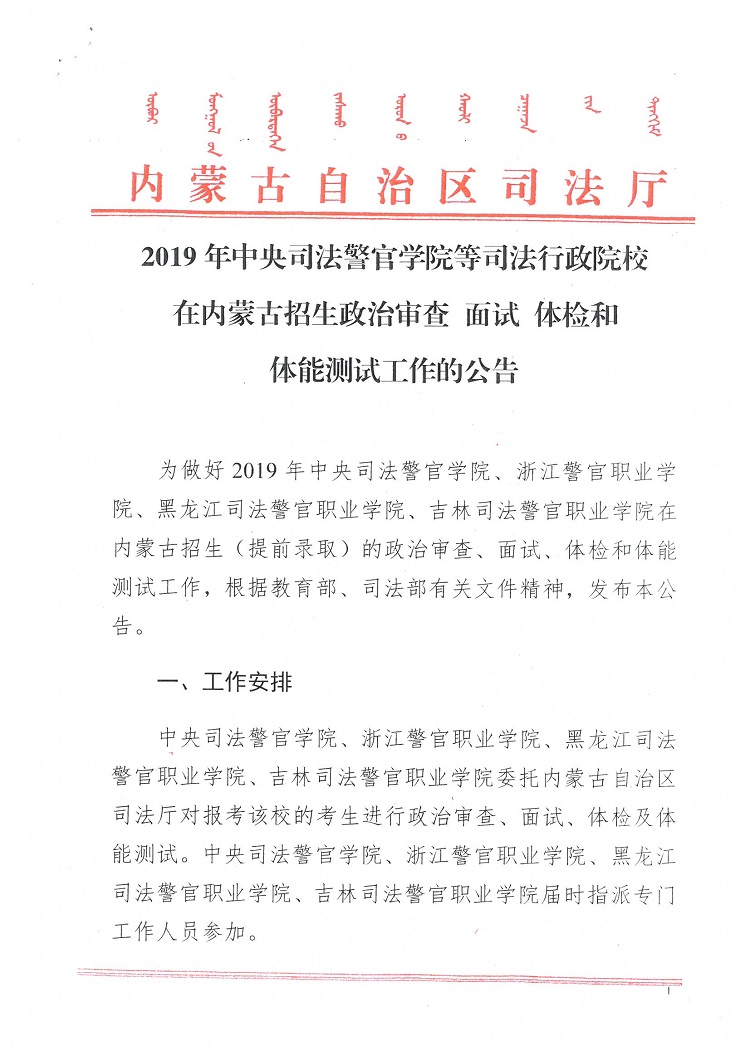 2019年中央司法警官学院等司法行政院校在内蒙古招生政治审查面试体检和体能测试工作的公告