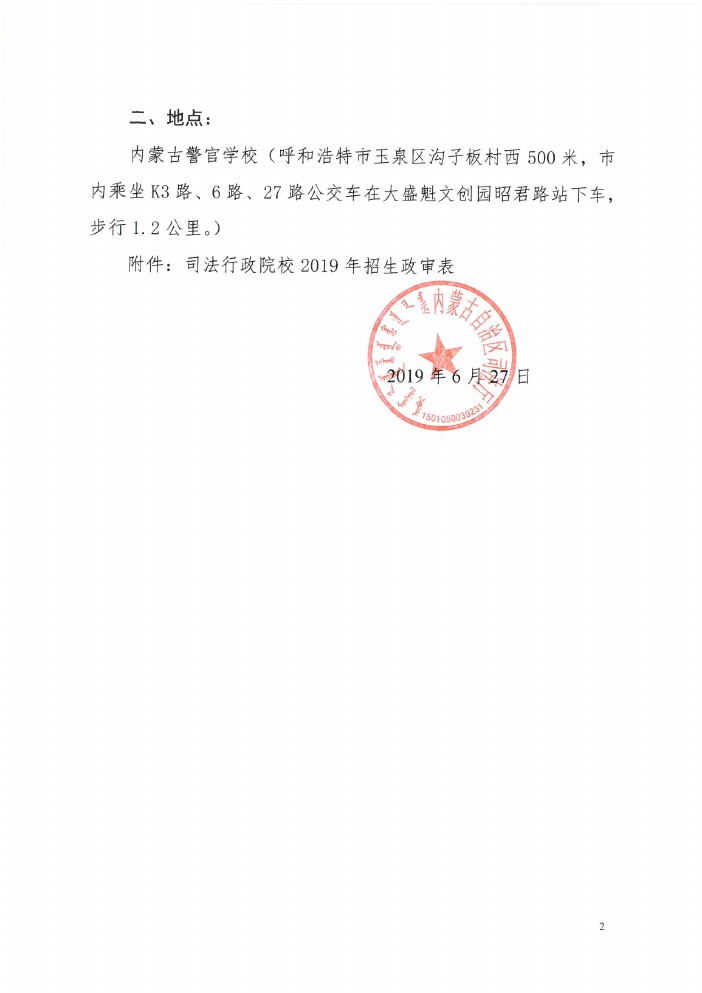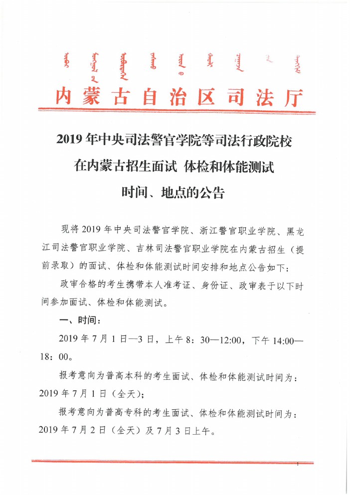 2019年中央司法警官学院等司法行政院校在内蒙古招生政治审查面试体检和体能测试工作的公告(更新)