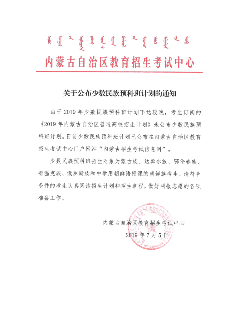 关于少数民族预科班计划的通知
