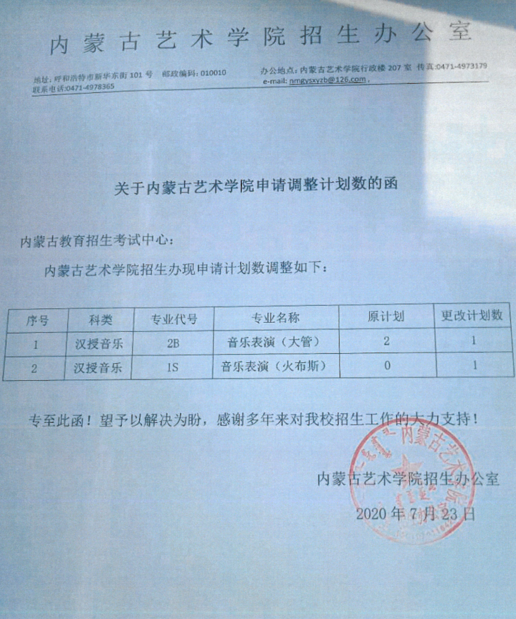 本科提前B 汉授音乐 (K91)内蒙古艺术学院关于调整计划数的说明
