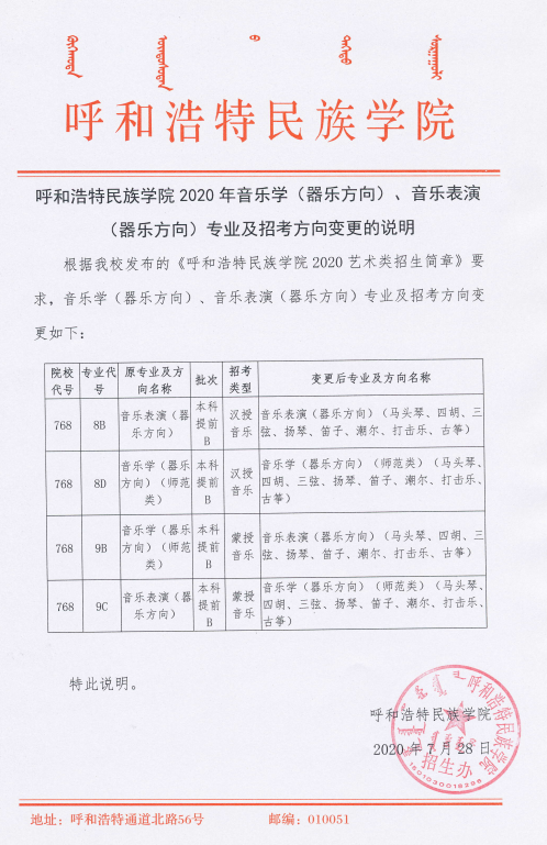 本科提前B 汉音蒙音 (768)呼和浩特民族学院关于计划修改的说明