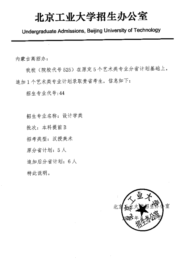 本科提前B 汉授美术 (525)北京工业大学增加计划的公告