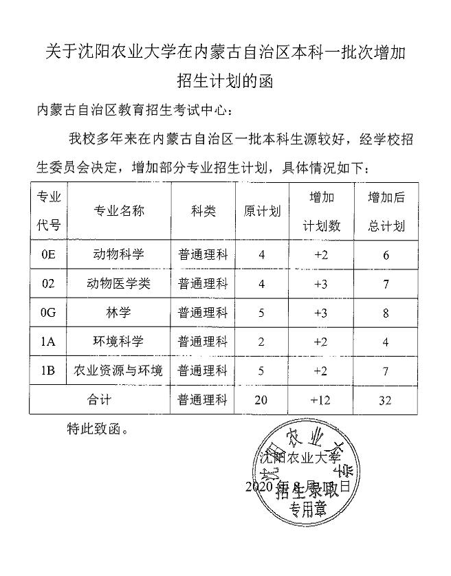 本科一批 普通理科 关于沈阳农业大学增加招生计划的公告