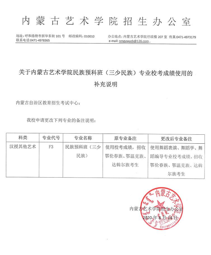内蒙古艺术学院民族预科班(三少民族)专业校考成绩使用的补充说明