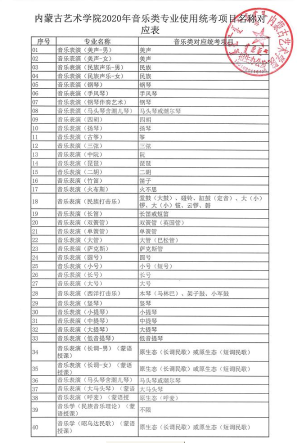 内蒙古艺术学院2020年音乐类专业使用统考项目名称对应表