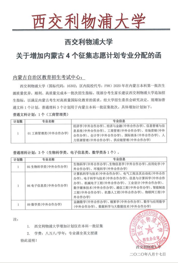 关于西交利物浦大学本科一批增加计划的说明