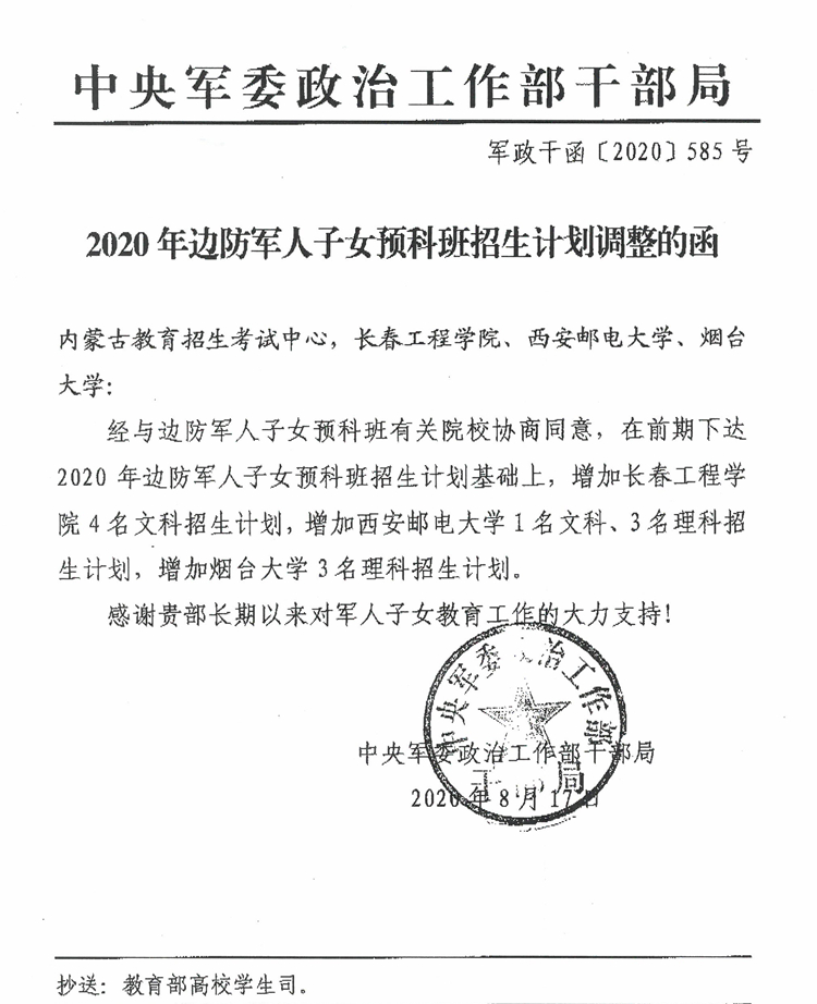 2020年边防军人子女预科班招生计划调整的说明