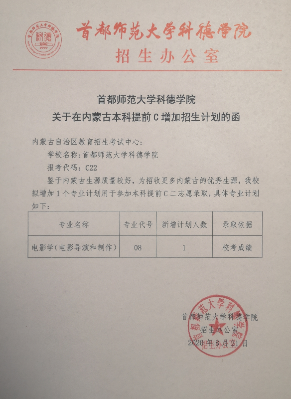 本科提前C 首都师范大学科德学院增加计划的说明