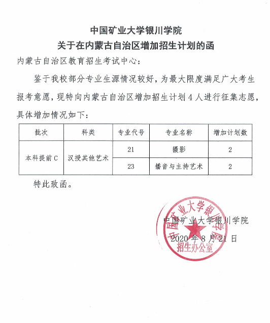 本科提前C 中国矿业大学银川学院增加招生计划的说明