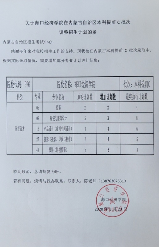 本科提前C 海口经济学院增加招生计划的说明