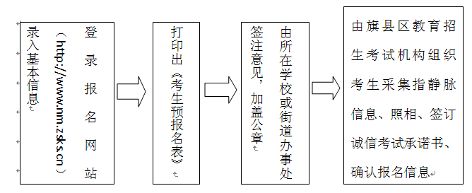 由旗县区教育招生考试机构组织考生进行采集指静脉信息、照相、签订诚信考试承诺书、确认报名信息。考生必须持二代居民身份证进行验证,否则,无法完成报名手续;丢失或未办理二代居民身份证的考生须提前到当地公安部门办理。