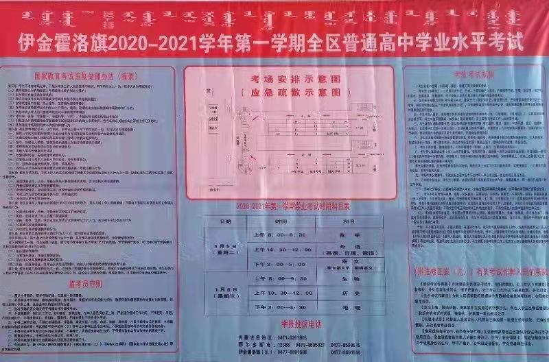 本网讯 2020-2021学年第一学期全区普通高中学业水平考试今天开考,考试时间为1月5日至6日,共2天。本次学业水平考试共开考数学、外语(英语、日语、俄语)、语文(蒙古语文甲、朝鲜语文)、生物、历史、地理等6个学科,全区高二、高三年级265931名考生总计报考809893科次,共设185个考点、4847个考场。今天的考试学科为数学、外语、语文。