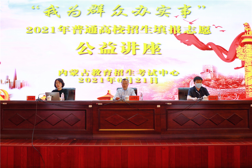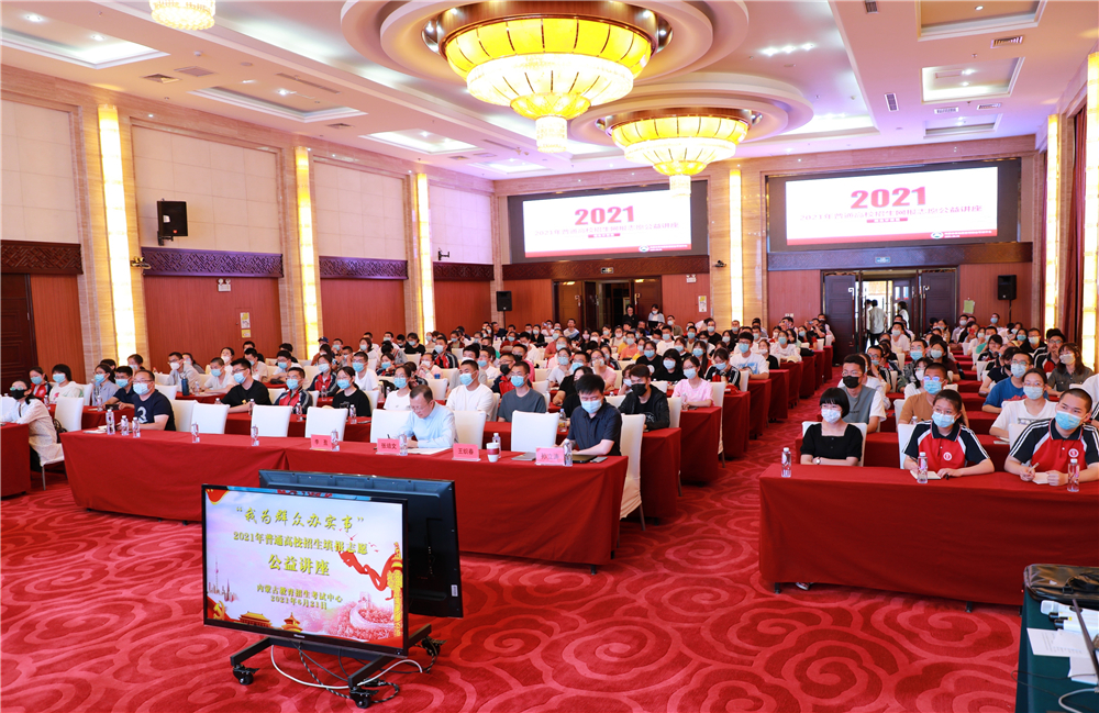 2021年6月21日下午,自治区教育招生考试中心组织的大型高考志愿填报公益讲座开讲。本次讲座以视频会议的形式进行,自治区主会场设在内蒙古自治区教育招生考试中心,盟市、旗县(市区)分会场设在当地国家教育考试考务指挥中心,全区各级招生考试机构相关业务人员,高中学校领导、教导处主任、高三年级组长、班主任和部分学生代表听取讲座。本次讲座全区共设120个会场,在各级会场现场听取讲座的共计3000多人。