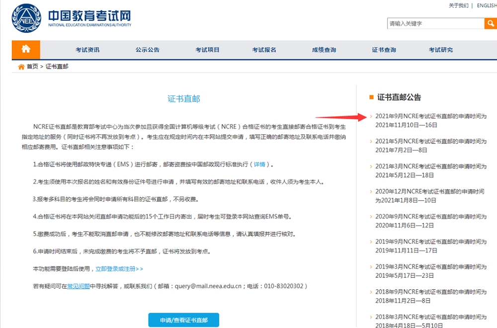 当前位置: 首页 > 新闻动态 2021年下半年内蒙古自治区全国计算机等级考试成绩于今日公布 2021-11-10 来源:自考与社考处 【本网讯】2021年下半年内蒙古自治区全国计算机等级考试于今日公布成绩。考生可登录“中国教育考试网”( https://www.neea.edu.cn/)进行成绩和证书查询。 面向获证考生的证书直邮申请也已开通,考生须于11月16日前登陆中国教育考试网提出申请。